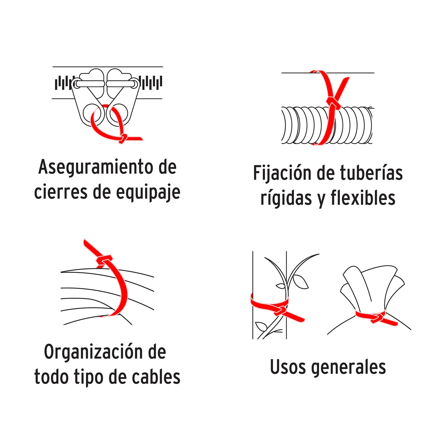 Su mecanismo de auto-cierre permite una fijación rápida y segura, y su diseño robusto los hace ideales para cargas de mayor peso o para agrupar cables más gruesos. El color rojo les da un toque distintivo y puede ser útil para codificación por colores en instalaciones. Son desechables y fáciles de instalar.