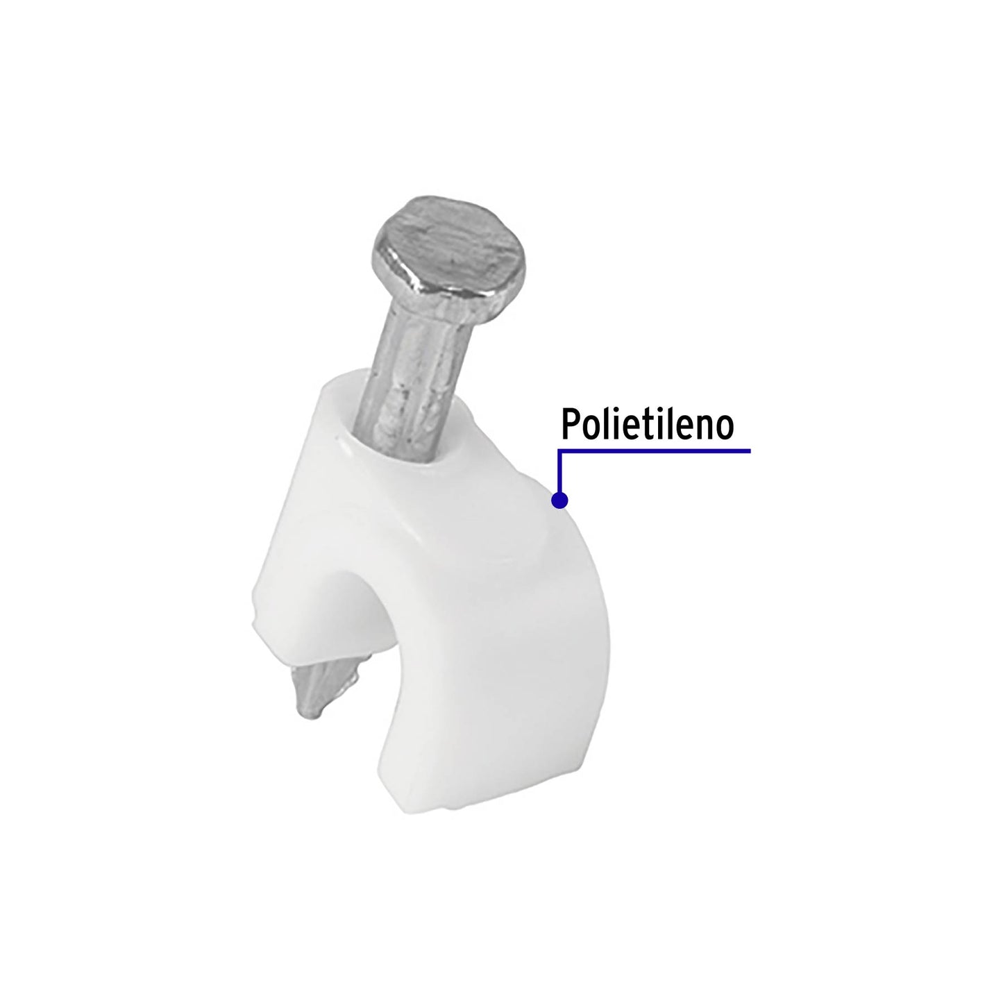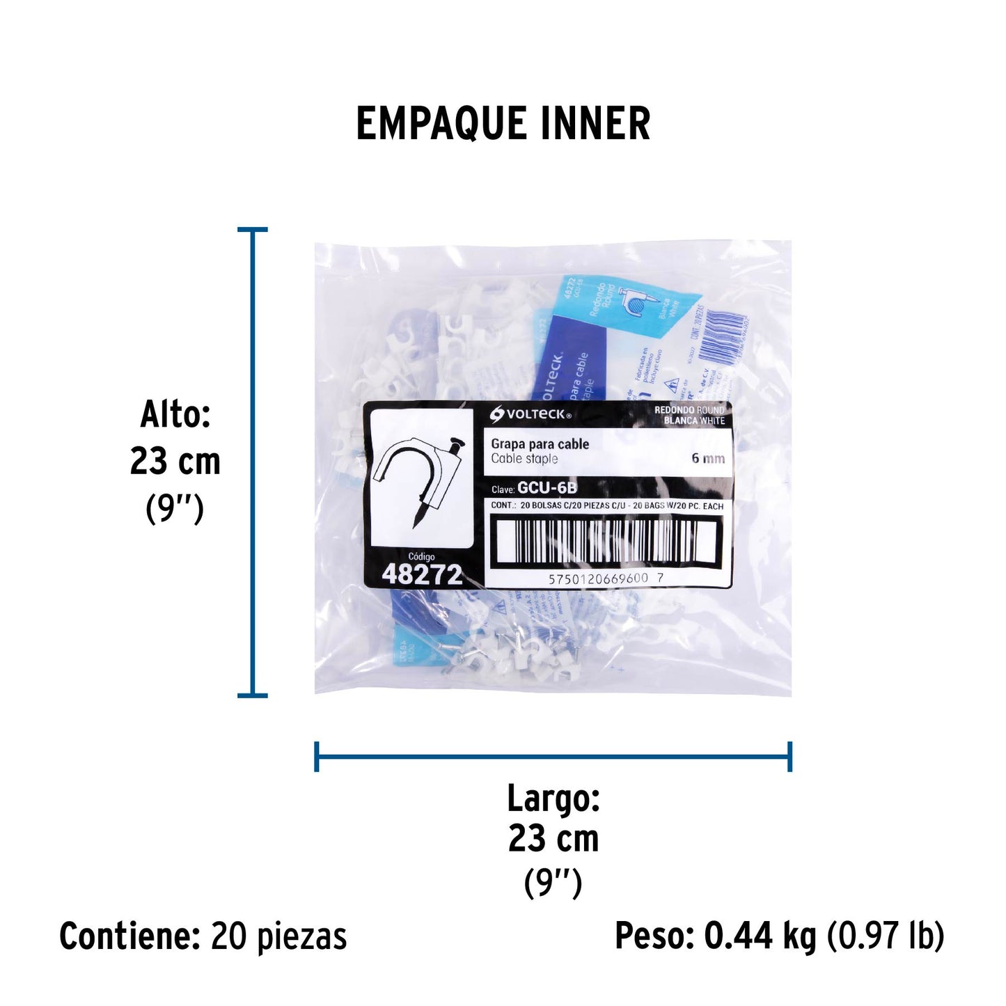 La Bolsa con 20 Grapas Volteck GCU-6B, con un diámetro de 6 mm y un elegante color blanco, es un accesorio de fijación esencial diseñado para la organización y el enrutamiento seguro de cables eléctricos redondos. Estas grapas, que incluyen un clavo de acero integrado, permiten sujetar firmemente el cable a paredes de madera o concreto, garantizando una instalación limpia y profesional que minimiza el riesgo de tropiezos o daños al cableado.