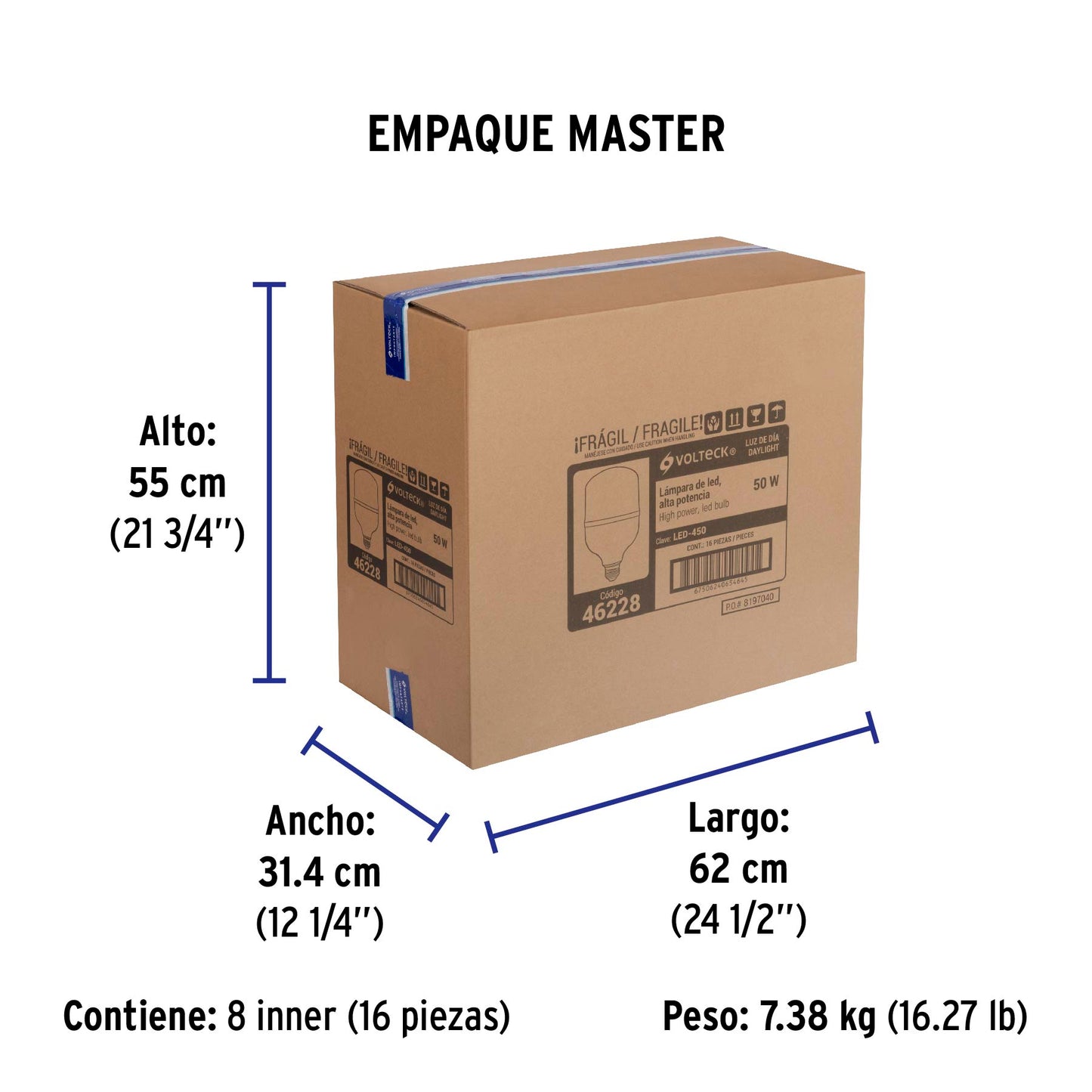 La lámpara LED de alta potencia de Volteck, clave LED-450, está diseñada para reemplazar las lámparas incandescentes de alto consumo en aplicaciones industriales, comerciales y residenciales. Con 50 W de potencia real, produce una iluminación equivalente a una lámpara de 450 W, lo que se traduce en un ahorro de energía significativo.