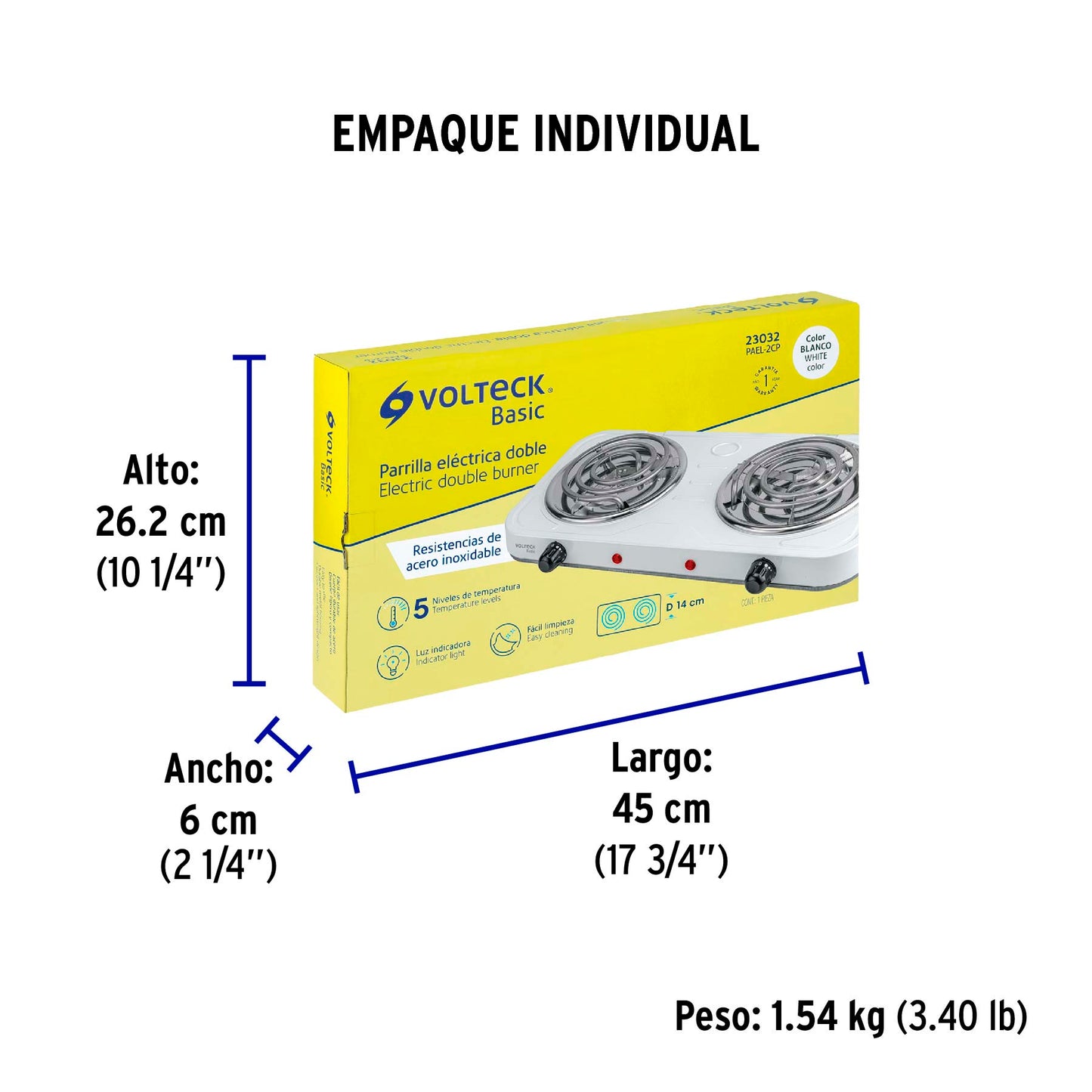 La Parrilla Eléctrica 2 Quemadores Volteck Basic PAEL-2CP, con resistencias en espiral y acabado en color blanco, es una solución de cocción versátil y eficiente, ideal para cocinas pequeñas, apartamentos, oficinas, o como complemento para ampliar la capacidad de cocción. Sus 2 quemadores proporcionan dos fuentes de calor independientes y controladas para calentar, cocinar y mantener alimentos simultáneamente.