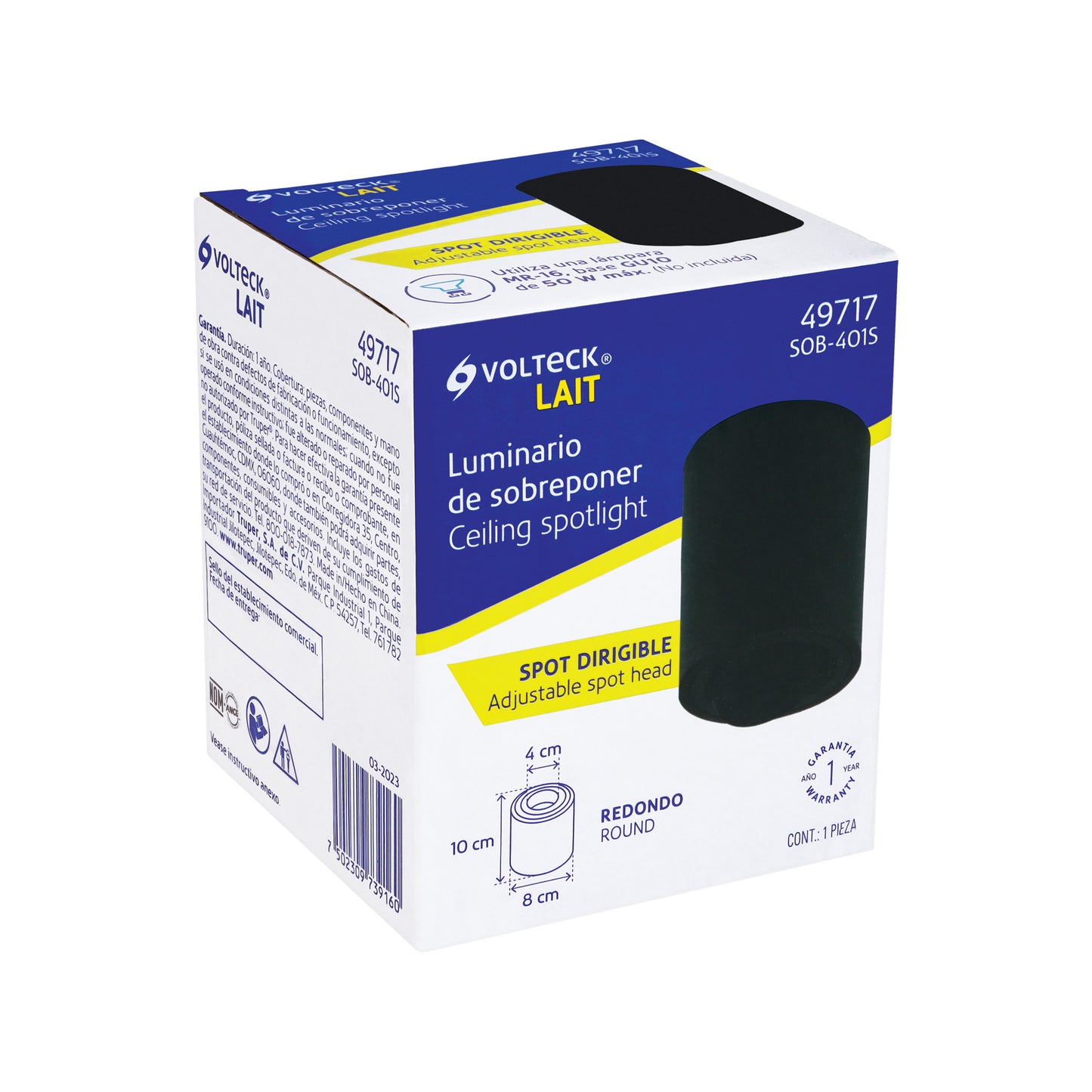 El Luminario de Sobreponer Volteck SOB-401S, con un spot y un elegante acabado en negro, es una solución de iluminación versátil y moderna diseñada para realzar elementos decorativos o arquitectónicos en espacios interiores. Su diseño de sobreponer en el techo o la pared ofrece una apariencia limpia y sofisticada, mientras que el spot dirigible permite al usuario enfocar el haz de luz en puntos específicos, creando un efecto dramático y personalizado.